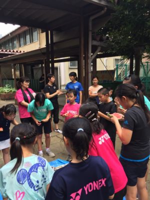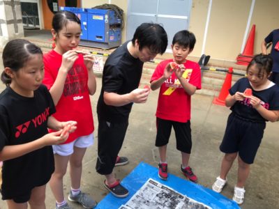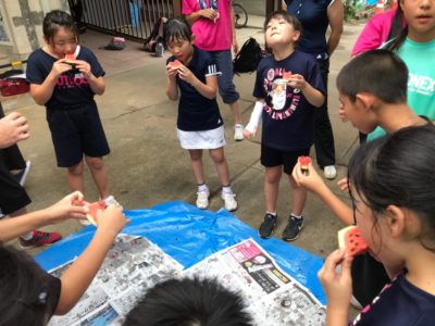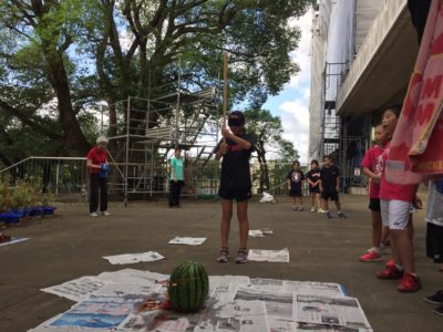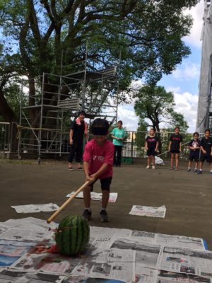 すいか割り開始トップバッター1年生から2人続きすいかにヒット!!