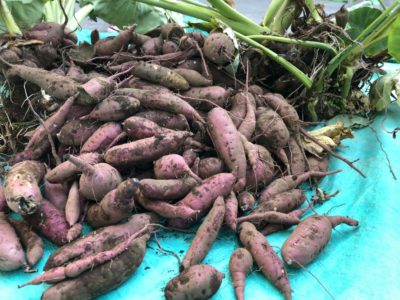 大きなお芋を掘り当て、隣の人と比べあったり、笑顔いっぱい大人も子供も楽しみました。